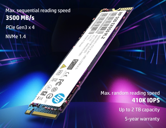 Powered by an 8-channel controller and 3D NAND Flash, the HP SSD EX950 M.2 hits speeds up to 3500 MB/s read 3000 MB/s write, offering PCIe 3.0 x 4 interface and NVMe 1.4 With low latency, it gives you the advantage in any battlefield.